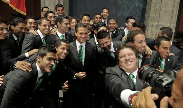 El marco, Palacio Nacional. Día, 27 de mayo de 2014. El presidente Enrique Peña Nieto abandera a la Selección Nacional de futbol ante 800 invitados. El gobierno en turno empleó el aparto del Estado e hizo suya la causa de una federación internacional y nacional deportiva que es negocio, pues involucra con pasión a muchos.